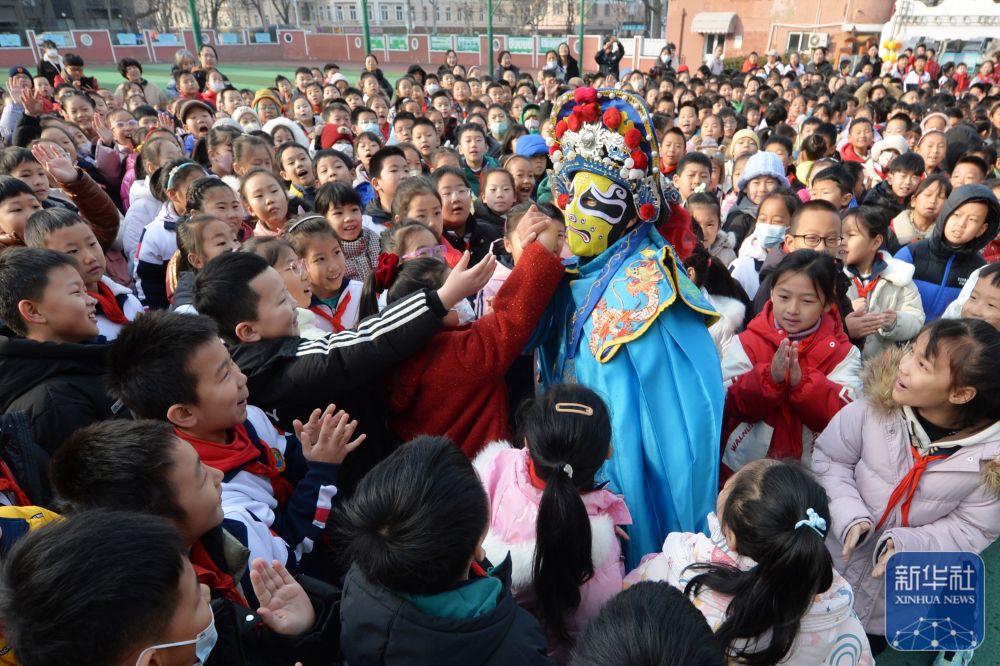 2月14日,學(xué)生們?cè)谏綎|青島四方小學(xué)“傳統(tǒng)文化潤(rùn)童心”主題活動(dòng)中與川劇變臉演員互動(dòng)。新華社發(fā)(王海濱攝)