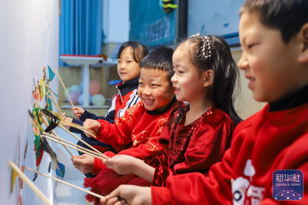2月14日,學(xué)生在山東省青島崇禮小學(xué)體驗(yàn)皮影戲表演。新華社發(fā)(張鷹攝)