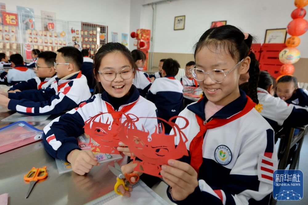 2月14日,兩名學(xué)生在山東青島宜陽路小學(xué)“傳統(tǒng)文化潤(rùn)童心”主題活動(dòng)中學(xué)習(xí)“哪吒”剪紙。新華社發(fā)(王海濱攝)