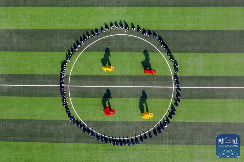 2月14日,山東省淄博科技學(xué)校龍獅社團(tuán)的學(xué)生在操場(chǎng)上進(jìn)行舞獅演練(無人機(jī)照片)。新華社發(fā)(張維堂攝)