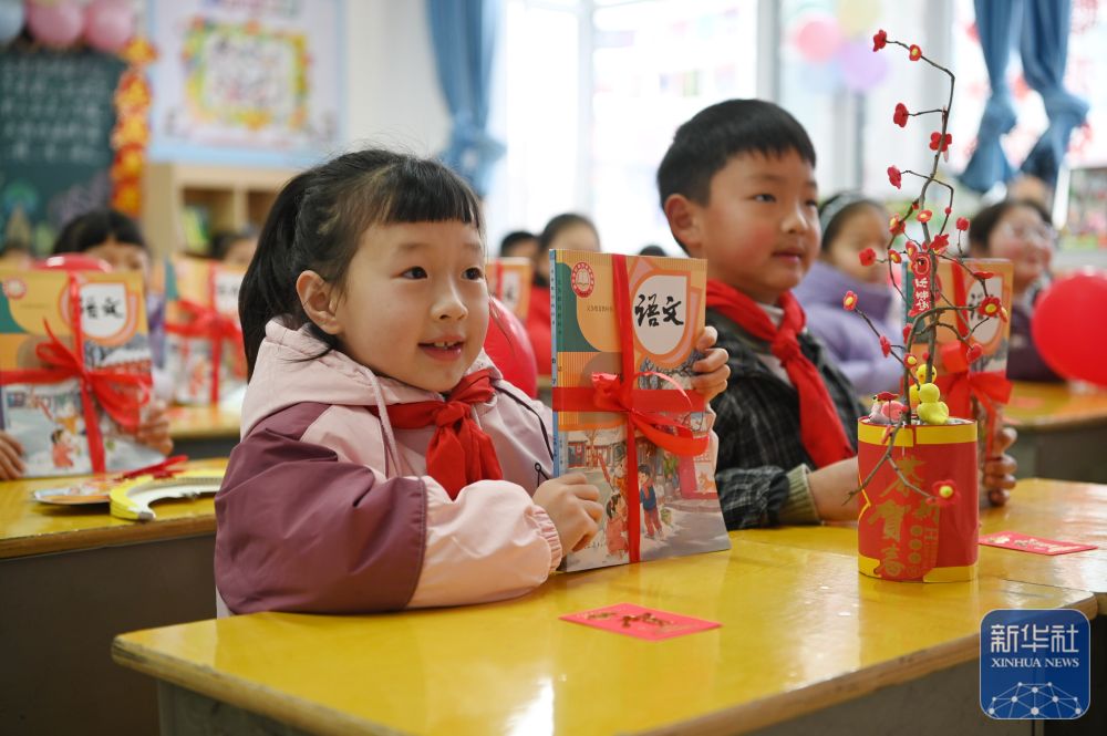 2月14日,在河南省沁陽市朱載堉學(xué)校,一年級(jí)學(xué)生展示領(lǐng)到的新課本。新華社發(fā)(楊帆攝)