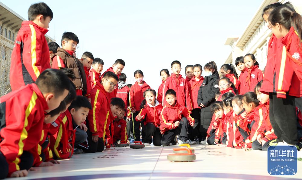2月14日,河北省滄州市東光縣第三實(shí)驗(yàn)小學(xué)的學(xué)生們?cè)谡n間參加陸地冰壺活動(dòng)。新華社發(fā)(周洋攝)