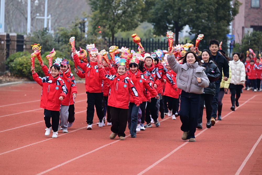 2025年2月14日,安徽省合肥市園上園小學(xué)喻崗分校師生在開學(xué)典禮上進(jìn)行“貪吃蛇”接力跑活動(dòng)。新華社記者 周牧 攝