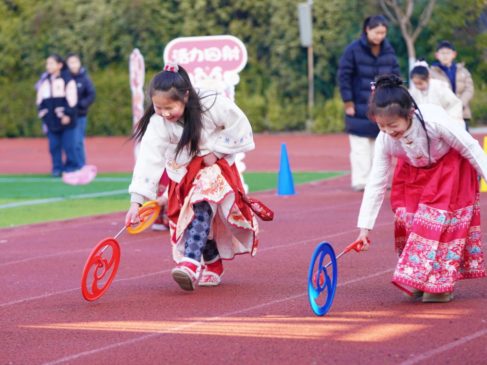 2025年2月13日,安徽省合肥市大通路小學(xué)組織學(xué)生滾鐵環(huán)。合肥市教育局供圖
