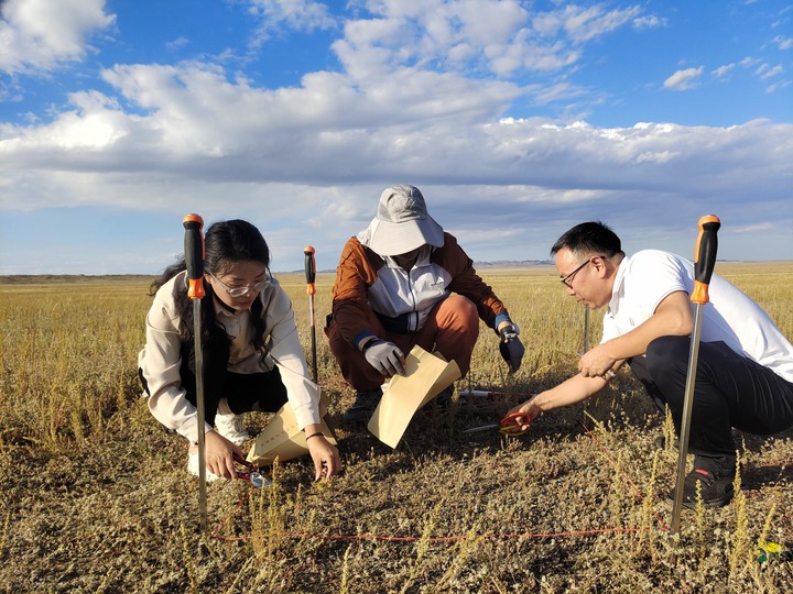 2024年生態(tài)質量地面監(jiān)測中,薄文真(左一)和同事正在采集植物樣本。(受訪者供圖)