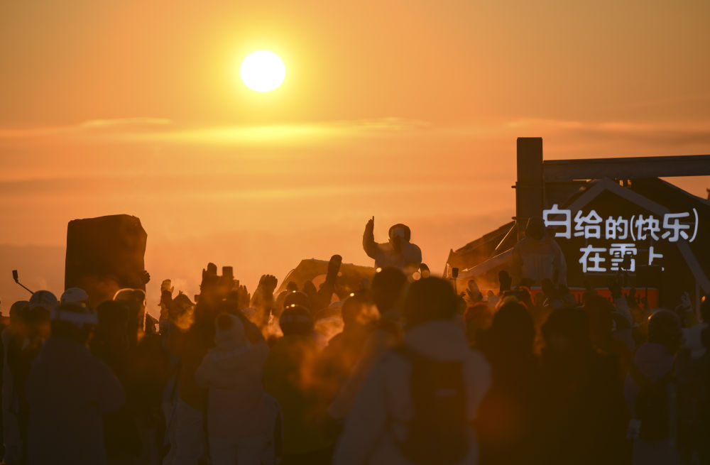 落日余暉灑在阿勒泰市將軍山國際滑雪度假區(qū)的山頂,漫山白雪被染成橙粉色。在現場電子音樂強勁的鼓點中,上千名滑雪愛好者歡呼搖擺,在零下十幾度的雪地里感受“蹦雪迪”的歡快。