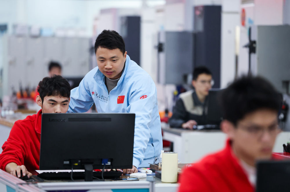 楊登輝(左二)指導(dǎo)學(xué)生對(duì)器件數(shù)控銑加工進(jìn)行程序編程。