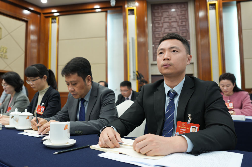 楊登輝(前右一)在十四屆全國(guó)人大三次會(huì)議廣東代表團(tuán)全體會(huì)議上認(rèn)真聽(tīng)取發(fā)言。