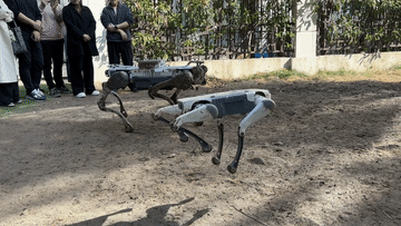 楊?。ㄗ蠖┖屯聻榭蛻?hù)展示一款行業(yè)應(yīng)用四足機(jī)器人。