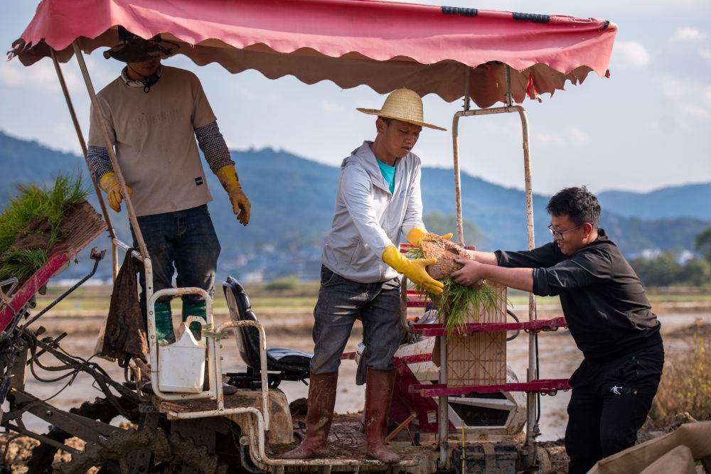 多年生稻科技小院的學(xué)生(右一)幫助當(dāng)?shù)剞r(nóng)民一起插秧。