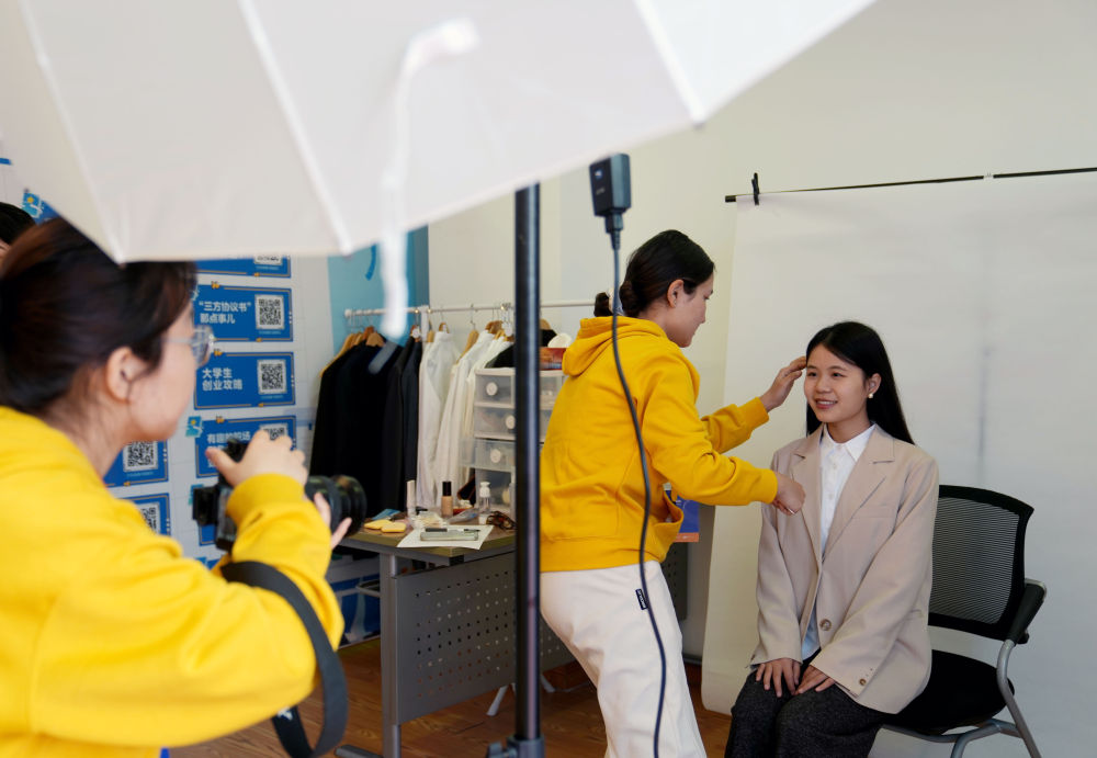 工作室的學(xué)生為求職學(xué)生拍攝形象照。