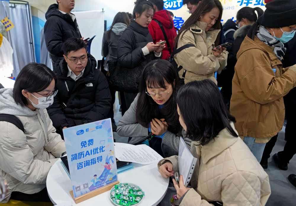 在上海一個(gè)大型招聘會(huì)現(xiàn)場(chǎng),工作室團(tuán)隊(duì)為求職者進(jìn)行簡(jiǎn)歷優(yōu)化指導(dǎo)。