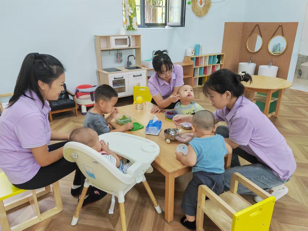 在北京的一家托育園里,孩子們在老師的照料下用餐。新華社發(fā)