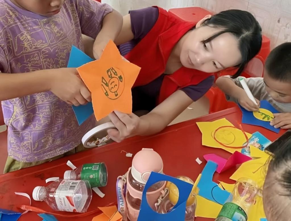 廣西南寧市武鳴區(qū)“愛心媽媽”志愿服務(wù)隊隊員與孩子一同做手工。新華社發(fā)