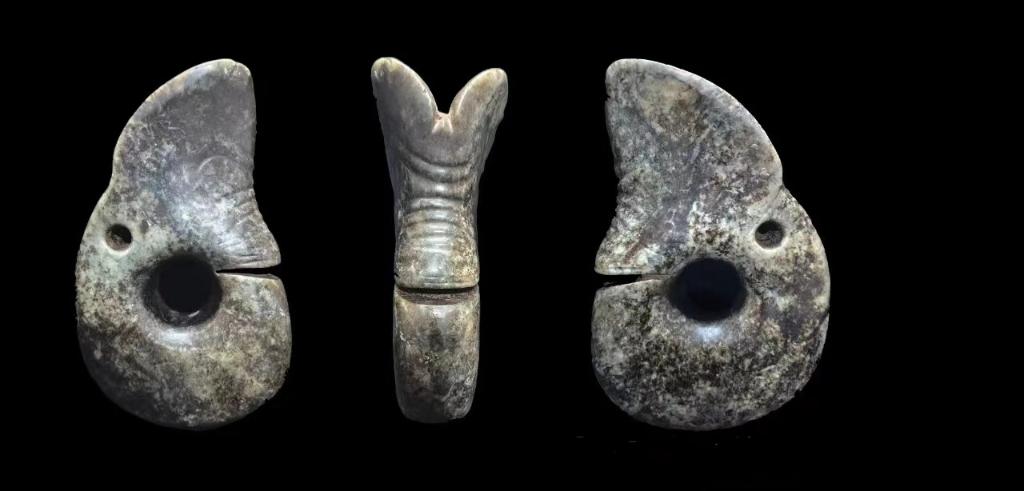玉龍是紅山文化玉器的典型代表。現(xiàn)藏于中國(guó)國(guó)家博物館的“C”形玉龍,因體形大、工藝精被譽(yù)為“中華第一龍”。2024年,紅山玉龍“家族”增添新成員,考古人員在內(nèi)蒙古赤峰市敖漢旗下洼鎮(zhèn)元寶山積石冢發(fā)現(xiàn)一件長(zhǎng)15.8厘米、寬9.5厘米、厚3厘米的玉龍,是目前考古發(fā)掘出土的體量最大的一件玉龍。和玉龍一同出土的還有玉環(huán)、玉璧、玉蠶、玉鸮等百余件玉器。