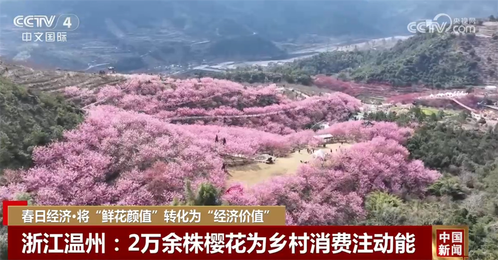 浙江省永嘉縣的溫州櫻花園占地3600畝,已開發(fā)利用1700多畝,種植了2萬余株櫻花,品種涵蓋臺(tái)灣牡丹櫻、紅粉佳人櫻等數(shù)十個(gè)品種。盛開的櫻花吸引了游客,也帶動(dòng)了當(dāng)?shù)夭惋嫛⒆∷?、旅游、交通等服?wù)消費(fèi)快速增長(zhǎng),自2月13日開園以來,櫻花園日均接待游客近3000人次,周末更是突破1萬多人。