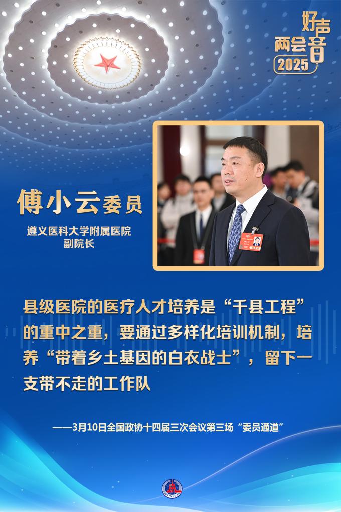 “國(guó)家持續(xù)實(shí)施‘千縣工程’,開(kāi)展醫(yī)療人才‘組團(tuán)式’支援幫扶,支援西藏、新疆、青海等地區(qū)醫(yī)院和國(guó)家鄉(xiāng)村振興重點(diǎn)幫扶縣人民醫(yī)院?!弊窳x醫(yī)科大學(xué)附屬醫(yī)院副院長(zhǎng)傅小云委員說(shuō)。