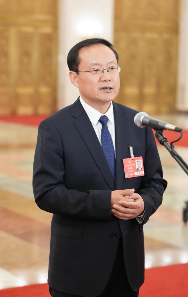 3月11日,第十四屆全國(guó)人民代表大會(huì)第三次會(huì)議第三場(chǎng)“部長(zhǎng)通道”集中采訪活動(dòng)在北京人民大會(huì)堂舉行。這是文化和旅游部部長(zhǎng)孫業(yè)禮接受媒體采訪。新華社記者 鄭煥松 攝