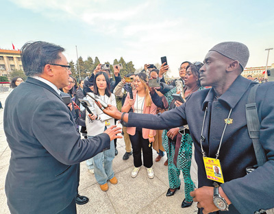 加納通訊社記者斯蒂芬·阿散蒂(右一)在中國全國兩會期間采訪。本報(bào)記者 馬 菲攝