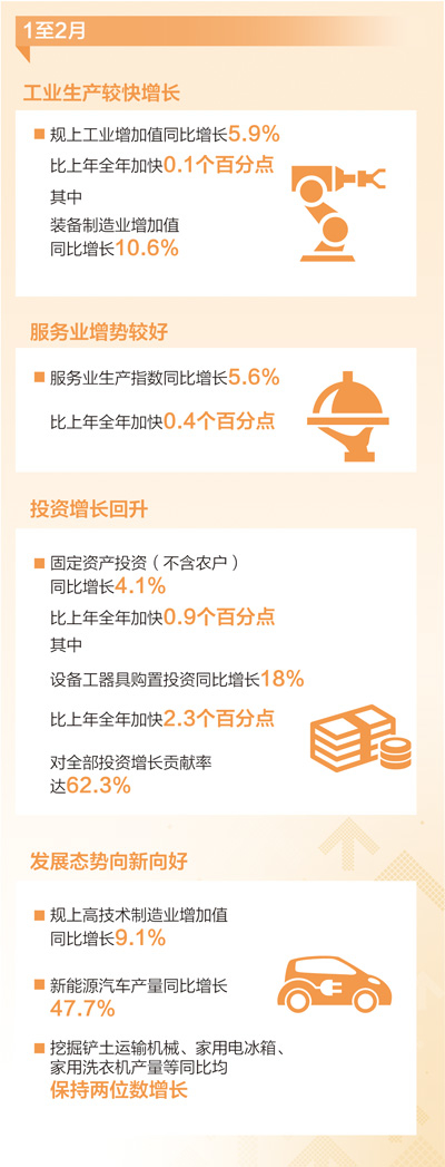 新型工業(yè)化穩(wěn)步推進(jìn),工業(yè)生產(chǎn)較快增長(zhǎng)。1至2月,規(guī)模以上工業(yè)增加值同比增長(zhǎng)5.9%,比上年全年加快0.1個(gè)百分點(diǎn)。其中,裝備制造業(yè)增加值同比增長(zhǎng)10.6%,對(duì)工業(yè)增長(zhǎng)支撐作用明顯。春節(jié)期間,假日經(jīng)濟(jì)活躍,帶動(dòng)信息技術(shù)、旅游交通出行相關(guān)行業(yè)增長(zhǎng),服務(wù)業(yè)增勢(shì)較好。1至2月,服務(wù)業(yè)生產(chǎn)指數(shù)同比增長(zhǎng)5.6%,比上年全年加快0.4個(gè)百分點(diǎn)。