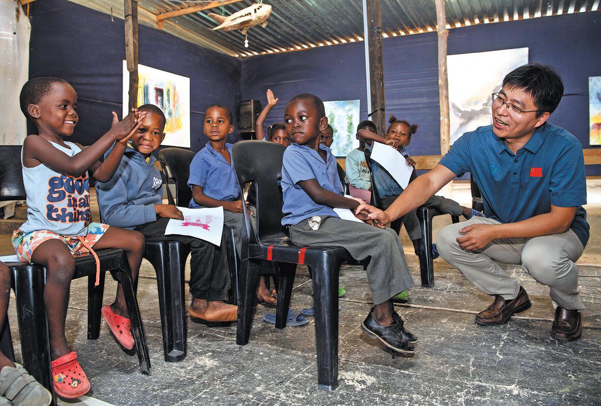 在納米比亞溫得和克的弗朗斯·南賓加藝術(shù)培訓(xùn)中心,一名中國醫(yī)療隊(duì)隊(duì)員向孩子們講解正確的洗手方法。(圖片/新華社)