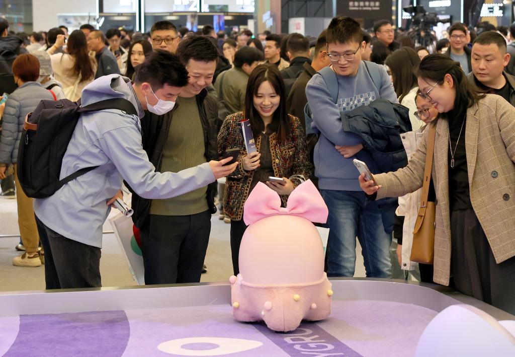 3月20日,參觀者在展會(huì)上與“Ai Me智能機(jī)器人”互動(dòng)。當(dāng)日,以“AI科技、AI生活”為主題的2025中國(guó)家電及消費(fèi)電子博覽會(huì)(AWE2025)在上海新國(guó)際博覽中心開幕。本屆展會(huì)吸引全球千余家企業(yè)參展,全景展示家電及消費(fèi)電子領(lǐng)域的前沿成果,呈現(xiàn)AI賦能智慧生活的新產(chǎn)品、新方案、新場(chǎng)景。(新華社記者 方喆 攝)