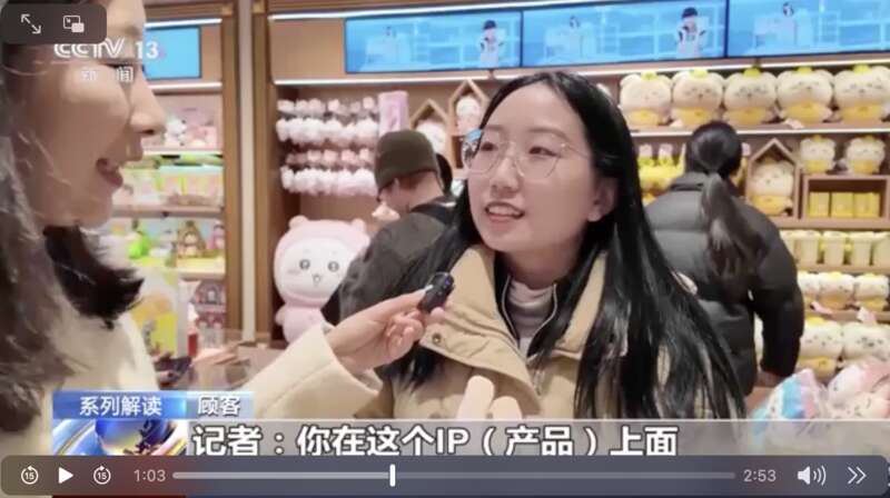 北京朝陽區(qū)的一家IP聯(lián)名店,可以看到首發(fā)、首秀的國(guó)產(chǎn)周邊衍生品。截圖來自央視新聞
