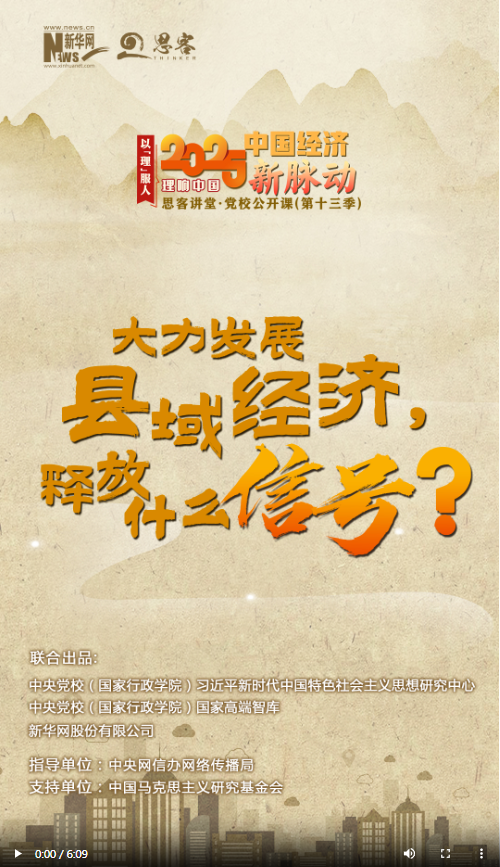 新一季“思客講堂·黨校公開課”《理響中國·以理服人|2025中國經(jīng)濟新脈動》,帶你讀懂2025年經(jīng)濟工作重點?!扒|大縣”不斷擴容,縣域消費“多點開花”,“縣域”二字越來越火,成為經(jīng)濟發(fā)展的關(guān)鍵詞。2025年政府工作報告和2024年中央經(jīng)濟工作會議都強調(diào)要大力發(fā)展縣域經(jīng)濟,這釋放了什么信號?中央黨校(國家行政學院)社會和生態(tài)文明教研部教授王曉莉?qū)Υ诉M行解讀。