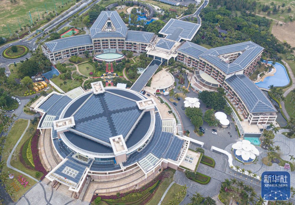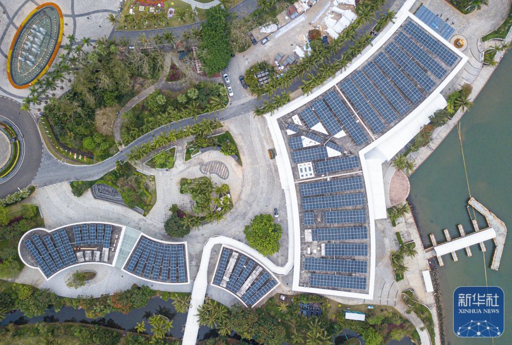 ↑ 這是在博鰲零碳示范區(qū)拍攝的博鰲亞洲論壇新聞中心及配樓屋頂?shù)墓夥O(shè)備(無人機(jī)照片,3月16日攝)。