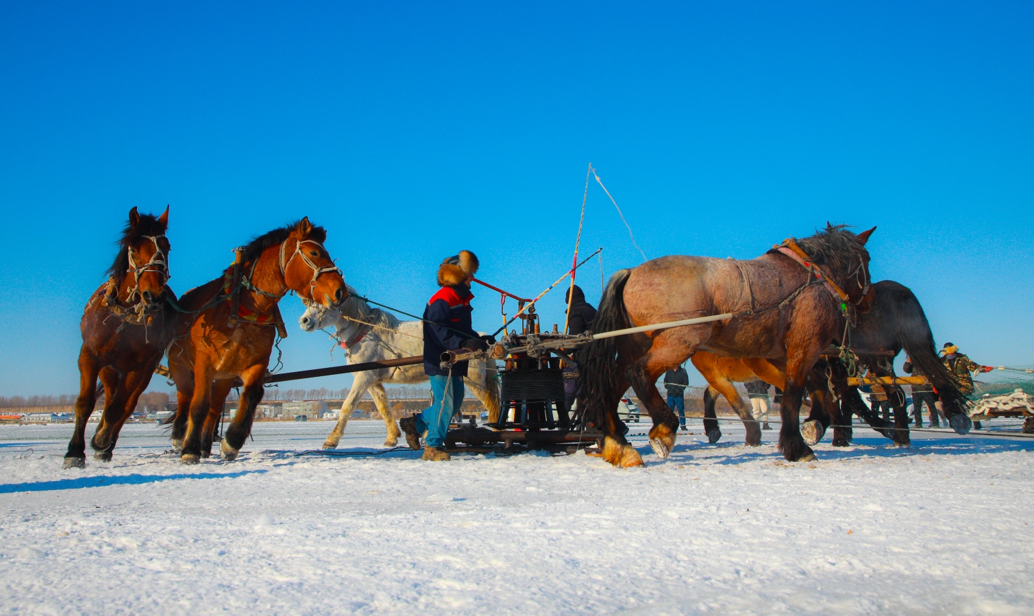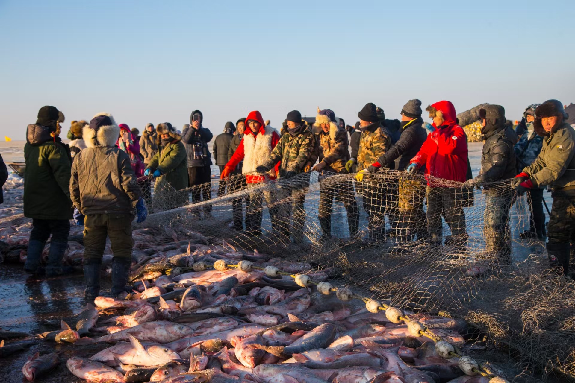 祭湖醒網(wǎng)、馬拉絞盤、冰下走網(wǎng)……一場(chǎng)冬捕盛宴正在千里冰封的查干湖上演。頭戴狐皮帽、身披羊皮襖、手持令旗的“魚把頭”一聲令下,巨大的漁網(wǎng)被緩緩從冰下拉出,隨著數(shù)萬(wàn)條活魚從水中“躍”起,“冰湖騰魚”的盛景讓傳承千年的漁獵文化在冰天雪地中再度“沸騰”。
