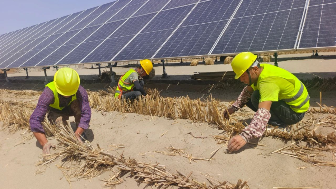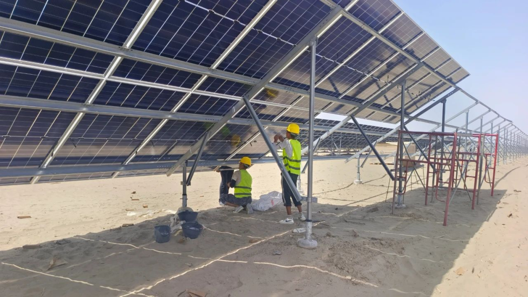 3月28日,在中國(guó)電建集團(tuán)新疆分公司新能源公司沙雅縣25萬(wàn)千瓦光伏項(xiàng)目施工現(xiàn)場(chǎng),工人們正緊張地安裝光伏板,周圍草方格的鋪設(shè)及梭梭的栽種也在同步開(kāi)展當(dāng)中。該項(xiàng)目施工負(fù)責(zé)人郝澤權(quán)說(shuō),光伏發(fā)電助力機(jī)電井抽取沙漠地表百米以下的微咸水灌溉梭梭林,解決了長(zhǎng)期以來(lái)沙漠植綠缺水難題,實(shí)現(xiàn)生態(tài)與經(jīng)濟(jì)的雙重收益。