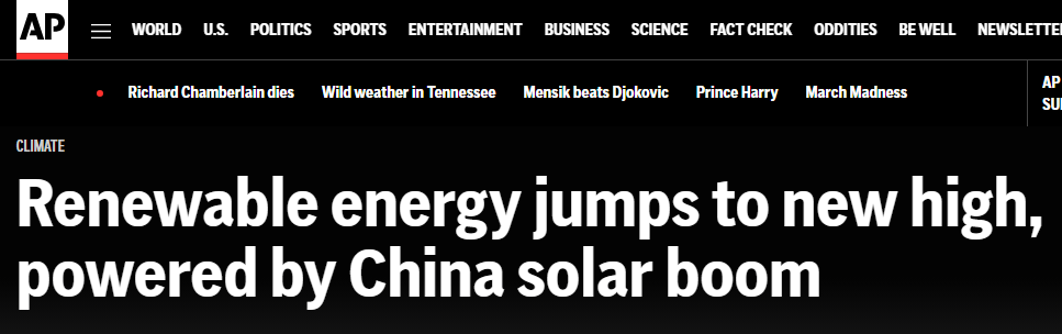 報道稱,中國太陽能熱潮推動了全球可再生能源發(fā)展。數據顯示,2024年,中國可再生能源發(fā)電新增裝機約3.74億千瓦,其中四分之三來自太陽能發(fā)電。
