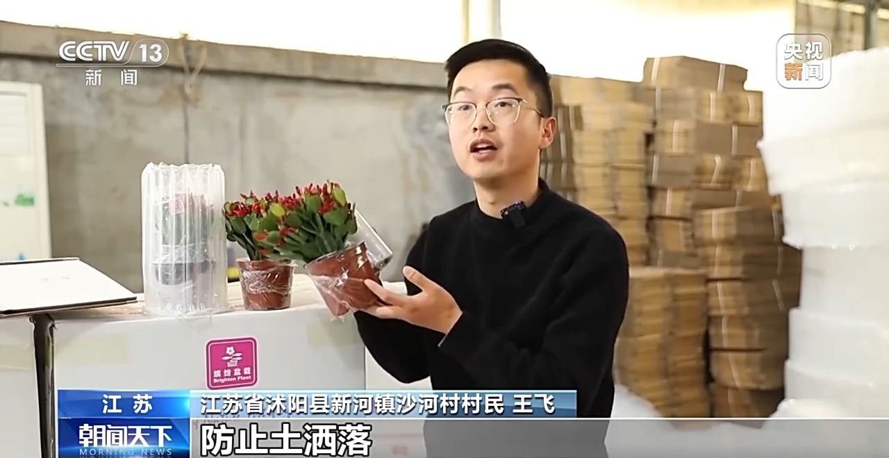 江蘇省沭陽縣新河鎮(zhèn)沙河村村民 王飛:我們先用保鮮膜鎖住盆里面的水分,防止土灑落,這樣的包裝可以讓花到買家手里時更新鮮一點(diǎn)。然后會用到防摔的氣柱,能保護(hù)花朵。