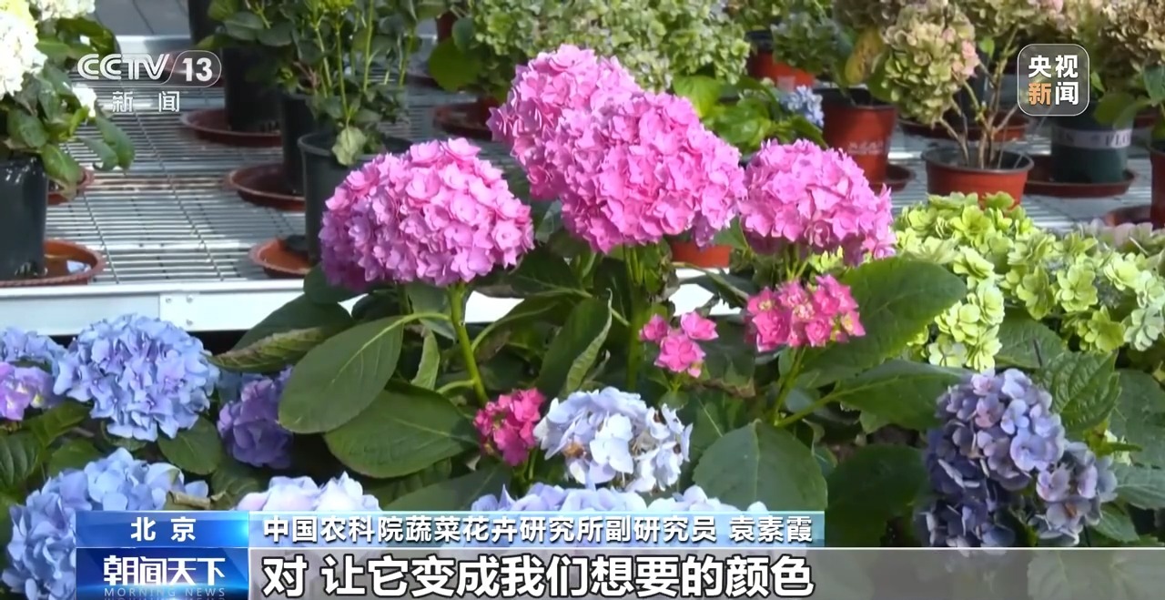 繡球被稱為植物中的變色龍,在中國農(nóng)科院的實(shí)驗(yàn)大棚里,粉色的花朵經(jīng)過科研人員的調(diào)控后,就會變成藍(lán)色稀有色,深受消費(fèi)者的喜愛。