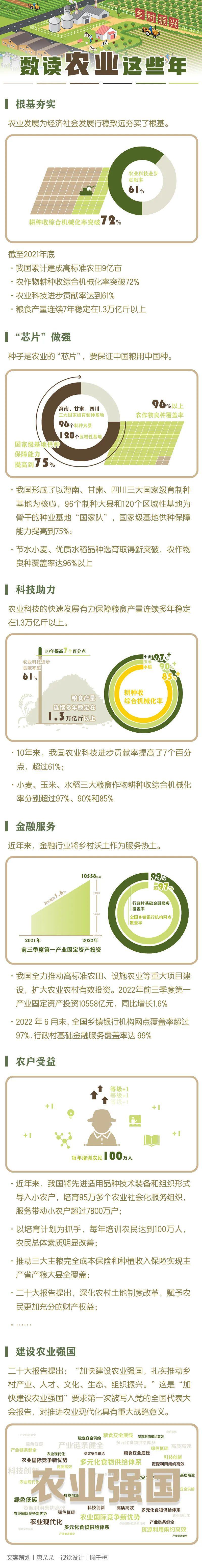 ◆ 截至2021年底,我國累計建成高標準農(nóng)田9億畝,農(nóng)作物耕種收綜合機械化率突破72%,農(nóng)業(yè)科技進步貢獻率達到61%,糧食產(chǎn)量連續(xù)7年穩(wěn)定在1.3萬億斤以上,為經(jīng)濟社會發(fā)展行穩(wěn)致遠夯實了根基。