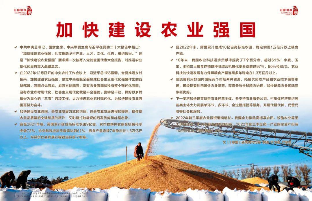中共中央總書記、國家主席、中央軍委主席習(xí)近平在黨的二十大報告中指出:“加快建設(shè)農(nóng)業(yè)強國,扎實推動鄉(xiāng)村產(chǎn)業(yè)、人才、文化、生態(tài)、組織振興?!边@是“加快建設(shè)農(nóng)業(yè)強國”要求第一次被寫入黨的全國代表大會報告,對推進農(nóng)業(yè)現(xiàn)代化具有重大戰(zhàn)略意義。