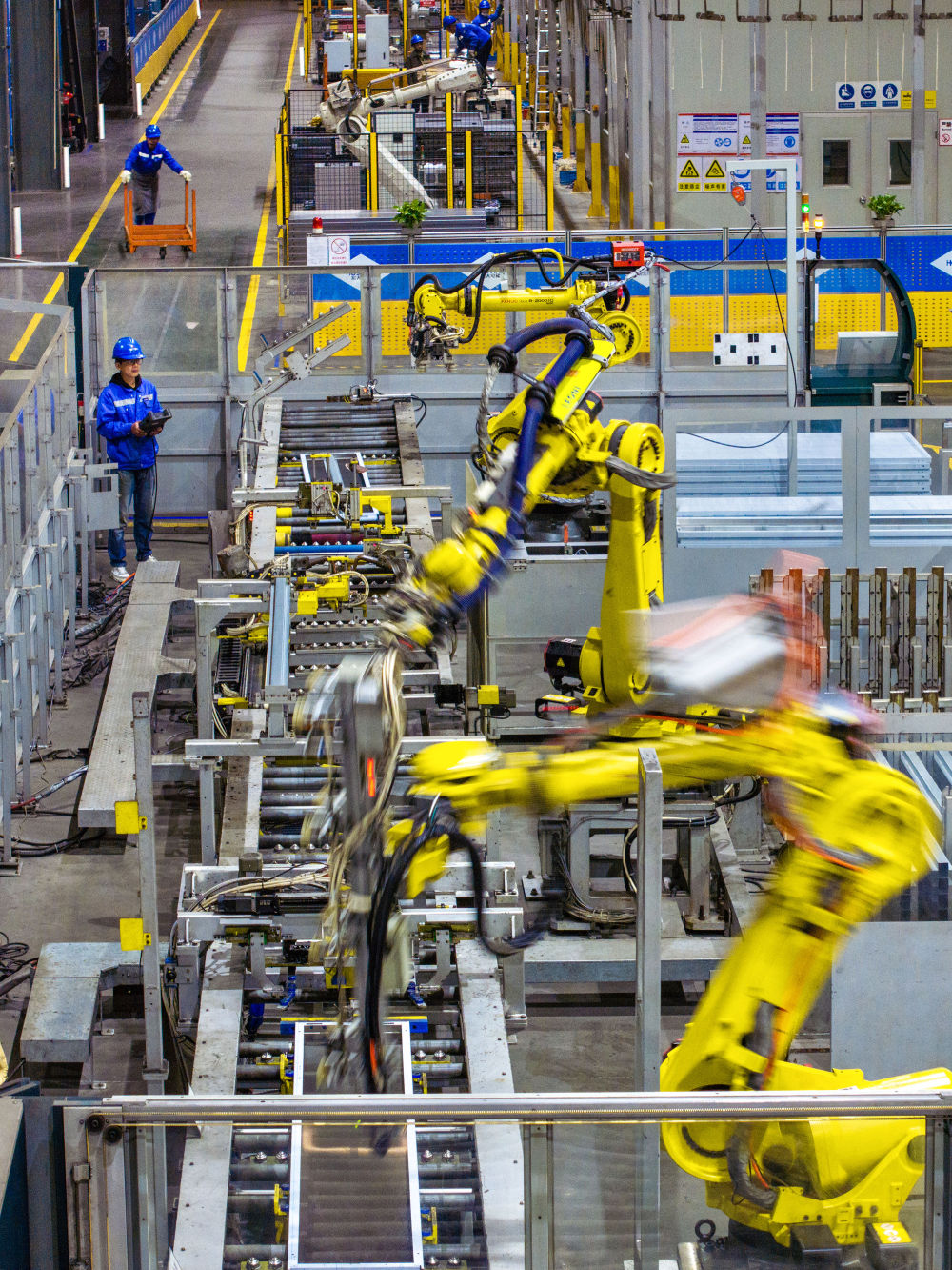 3月29日,浙江省寧波宏大電梯有限公司的工人在生產(chǎn)線上忙碌(無人機(jī)照片)。