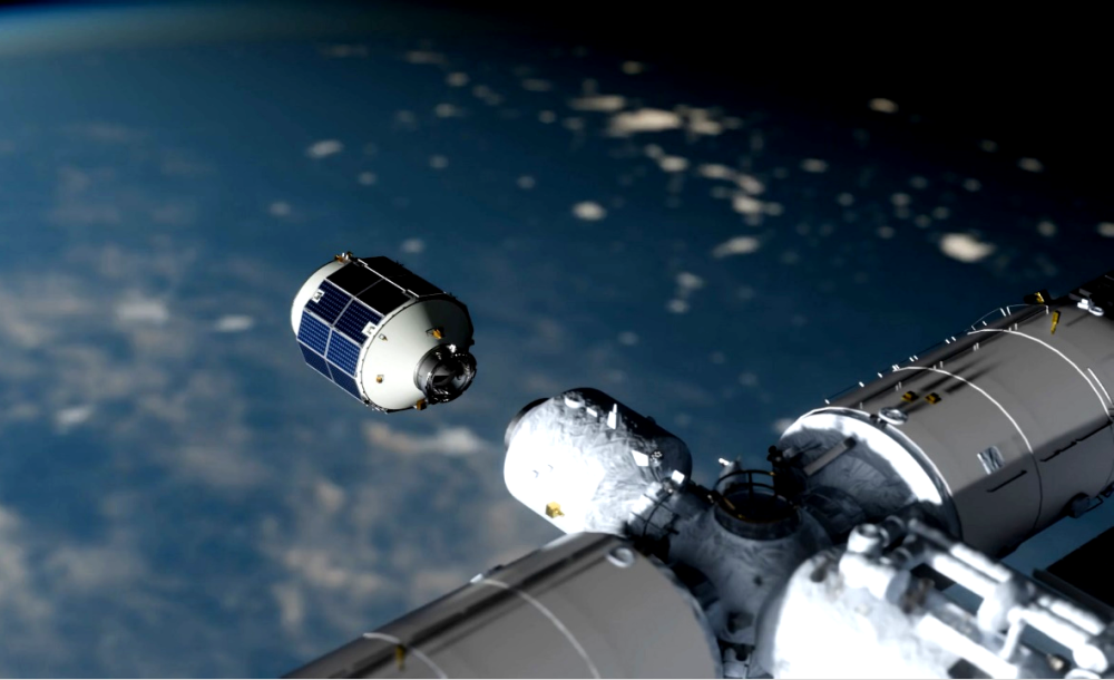 輕舟貨運飛船與中國空間站對接示意圖。(中國科學院微小衛(wèi)星創(chuàng)新研究院供圖)