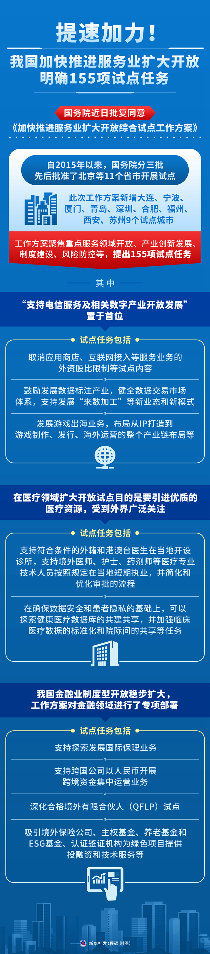 具體來看,工作方案聚焦重點(diǎn)服務(wù)領(lǐng)域開放、產(chǎn)業(yè)創(chuàng)新發(fā)展、制度建設(shè)、風(fēng)險(xiǎn)防控等,提出155項(xiàng)試點(diǎn)任務(wù)。