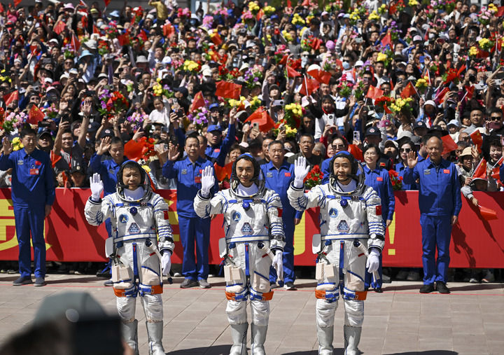 4月24日,神舟二十號(hào)載人飛行任務(wù)航天員乘組出征儀式在酒泉衛(wèi)星發(fā)射中心問(wèn)天閣圓夢(mèng)園廣場(chǎng)舉行。這是航天員陳冬(右)、陳中瑞(中)、王杰在出征儀式上。新華社記者 連振 攝