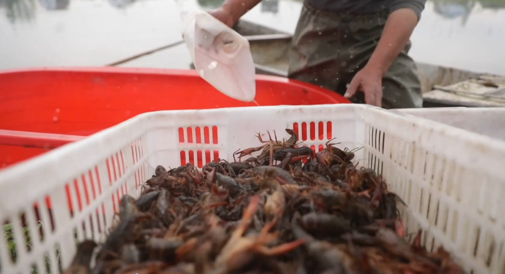 剛出水的小龍蝦被立即送往分揀中心,進(jìn)行質(zhì)量檢驗和稱重分級。分揀線上,分揀工岳臘春戴著橡膠手套,指尖翻飛間完成了龍蝦的分級。岳臘春說,“我們是發(fā)月工資,一個月5000元,一天工作按貨的多少來定。”