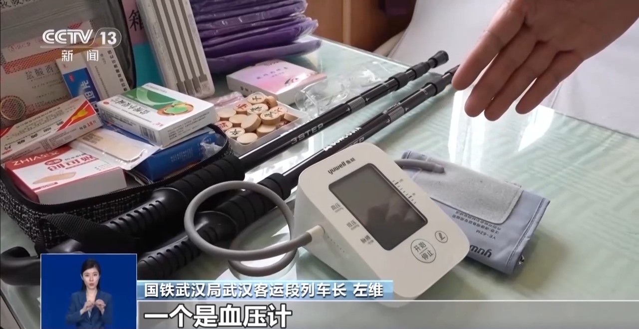 國(guó)鐵武漢局武漢客運(yùn)段列車(chē)長(zhǎng) 左維:我們列車(chē)提供了以下這些物品:血壓計(jì)、老年人經(jīng)常使用基礎(chǔ)藥包,在車(chē)廂里面還設(shè)置了無(wú)障礙廁所,早上還提供軟食,老年旅客更容易消化吸收。