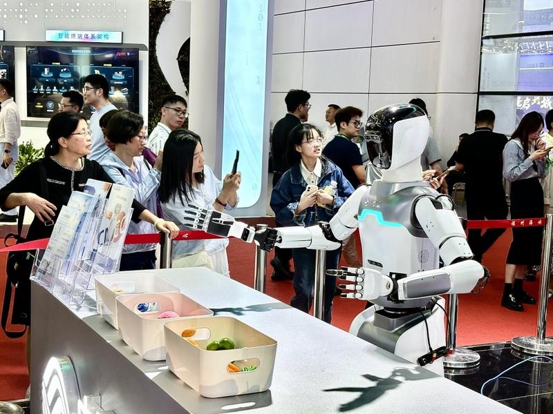 第八屆數(shù)字中國(guó)建設(shè)峰會(huì)現(xiàn)場(chǎng),游客駐足圍觀人形機(jī)器人。(鄭雅梅 攝)