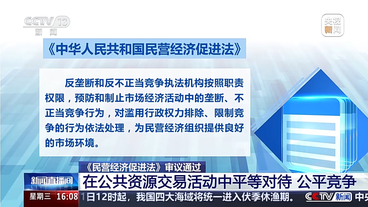 據(jù)楊合慶介紹,民營經(jīng)濟(jì)促進(jìn)法在保障公平競爭方面,完善了民營經(jīng)濟(jì)組織市場準(zhǔn)入領(lǐng)域公平參與市場競爭的制度機(jī)制,把實(shí)踐中行之有效的政策和做法確定為法律制度。