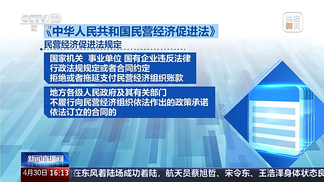 另外,民營經(jīng)濟(jì)促進(jìn)法規(guī)定,國家機(jī)關(guān)、事業(yè)單位、國有企業(yè)違反法律、行政法規(guī)規(guī)定或者合同約定,拒絕或者拖延支付民營經(jīng)濟(jì)組織賬款,地方各級人民政府及其有關(guān)部門不履行向民營經(jīng)濟(jì)組織依法作出的政策承諾、依法訂立的合同的,由有權(quán)機(jī)關(guān)予以糾正,造成損失的,依法予以賠償;造成不良后果或者影響的,對負(fù)有責(zé)任的領(lǐng)導(dǎo)人員和直接責(zé)任人員依法給予處分。