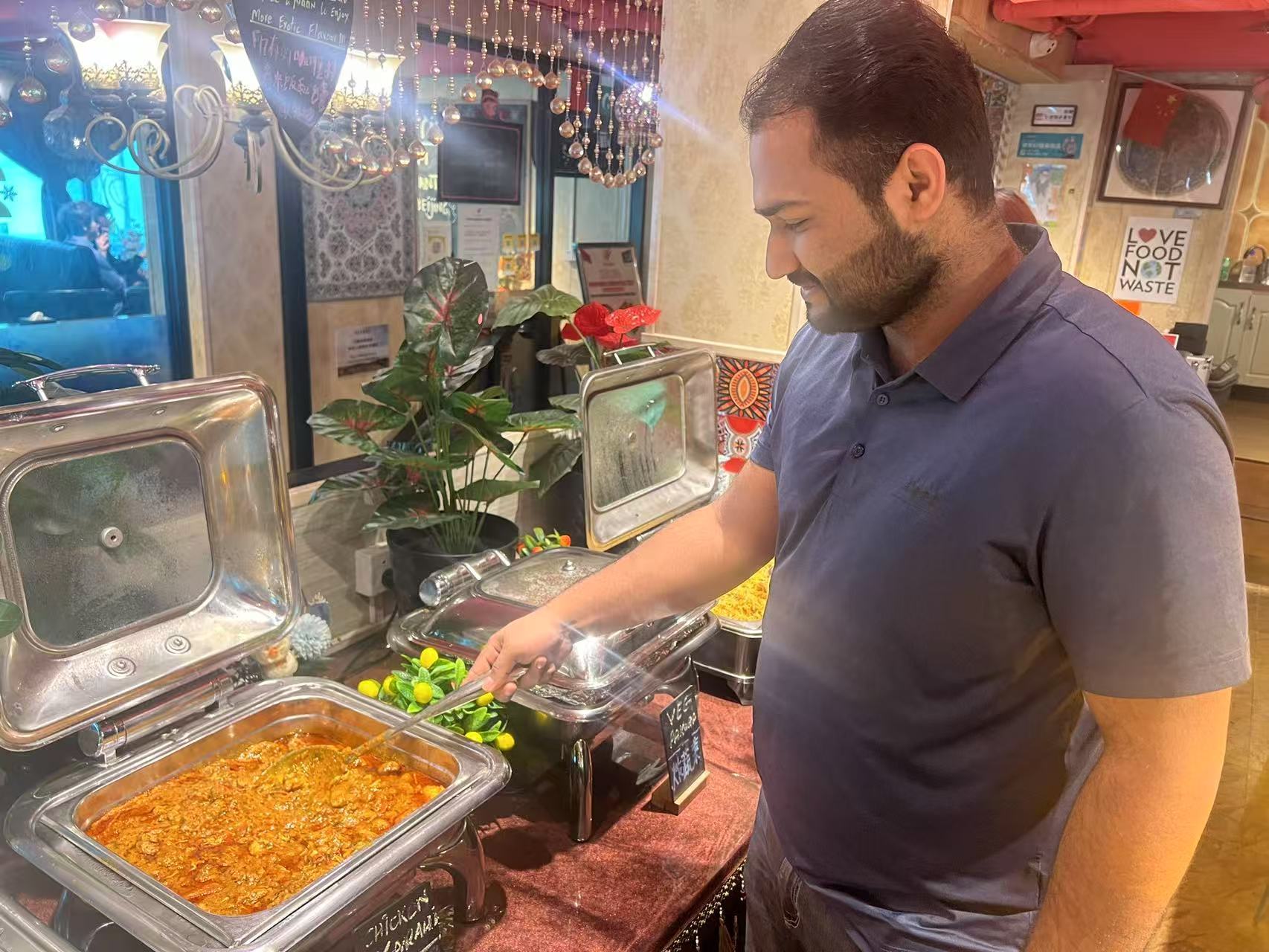 采訪時,正值午餐時間,客人絡(luò)繹不絕,阿馬德一邊跟客人打招呼,一邊向記者介紹。其中有一位客人是從阿爾及利亞到中國旅游的,特地從網(wǎng)上搜索巴基斯坦餐廳才找到這里。
