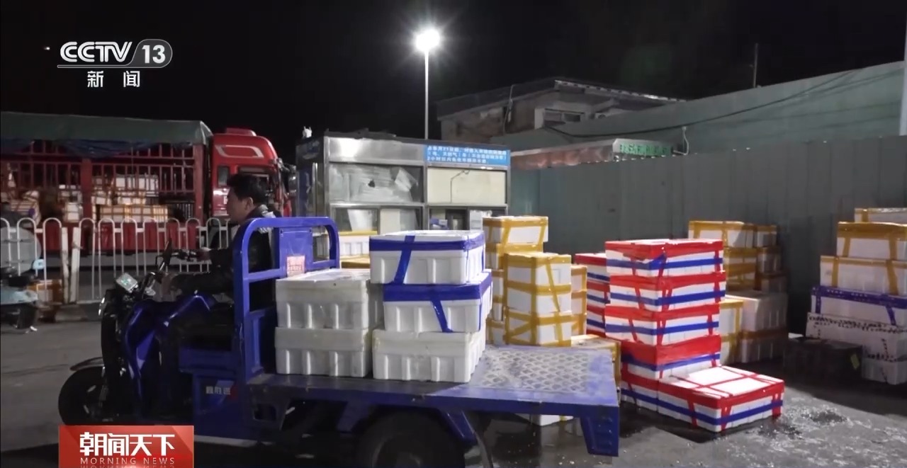 總臺(tái)央視記者 張琪:在北京大紅門(mén)京深海鮮批發(fā)市場(chǎng),凌晨2點(diǎn)半,進(jìn)場(chǎng)的車輛絡(luò)繹不絕,物流停車場(chǎng)也停滿了正在卸貨的貨車。