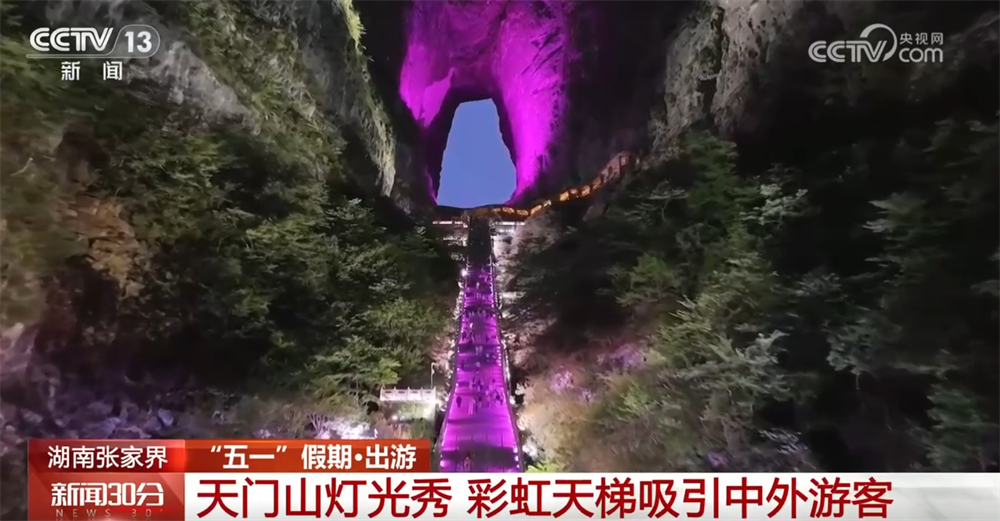 “五一”假期,湖南天門(mén)山景區(qū)以自然風(fēng)光吸引中外游客。隨著夜幕降臨,天門(mén)山山體被五彩燈光點(diǎn)亮,999級(jí)彩虹臺(tái)階燈光流轉(zhuǎn),遠(yuǎn)看就像一道連通天地的彩虹橋,將千年奇觀天門(mén)洞裝點(diǎn)得更加巍峨壯觀。