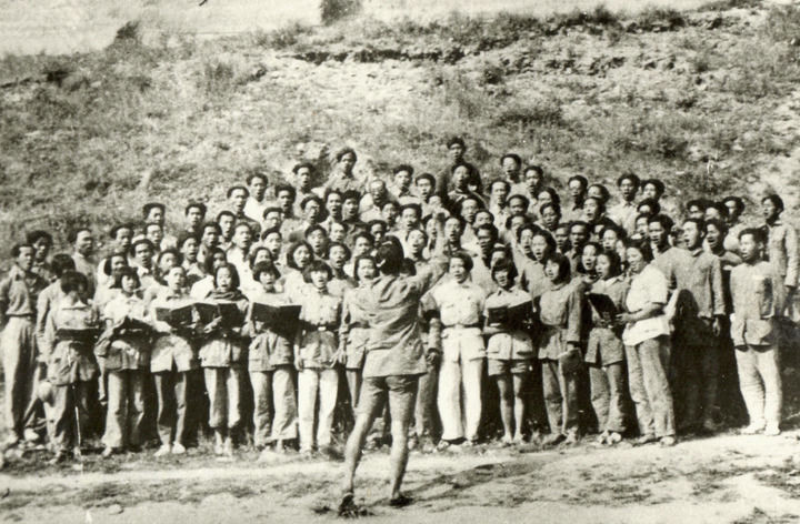 這是1939年冼星海指揮魯藝學(xué)員排練《黃河大合唱》的資料照片。