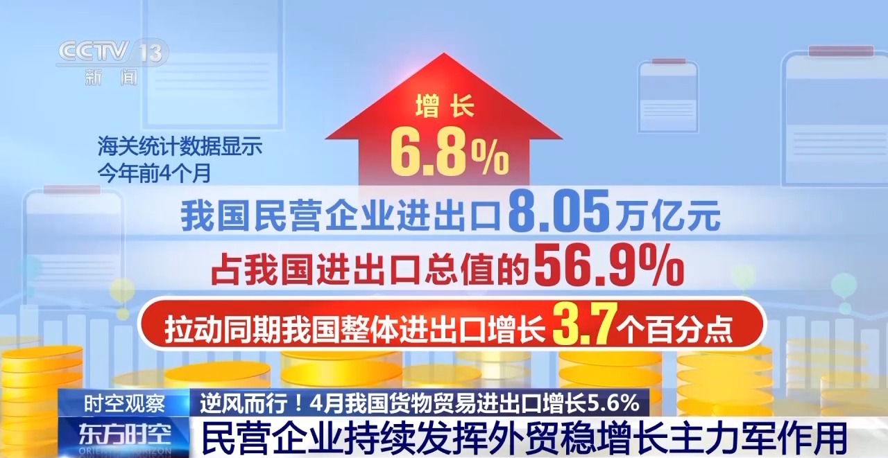 海關(guān)總署統(tǒng)計(jì)分析司司長 呂大良:今年以來,各項(xiàng)促進(jìn)民營經(jīng)濟(jì)發(fā)展的政策措施協(xié)同發(fā)力,參與外貿(mào)的民營企業(yè)數(shù)量穩(wěn)定增加。前4個(gè)月,有進(jìn)出口實(shí)績的民營企業(yè)達(dá)49.2萬家,增加8.2%,占我國有進(jìn)出口實(shí)際企業(yè)數(shù)量的86.5%。